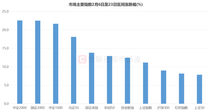 随着A股近期持续修复,市场交投活跃度大幅升温,不少指数和个股均迎来V字反弹。回顾此次反弹历程,以沪指录得的8连阳为区间行情(2月6日至23日)统计,小微盘股在此轮修复行情中反弹迅猛,中证2000、国证2000、中证1000同期涨幅均在20%以上,而权重代表指数沪深300、红利指数、上证50指数同期涨幅相对靠后,不过,其均也有超7%的涨幅。