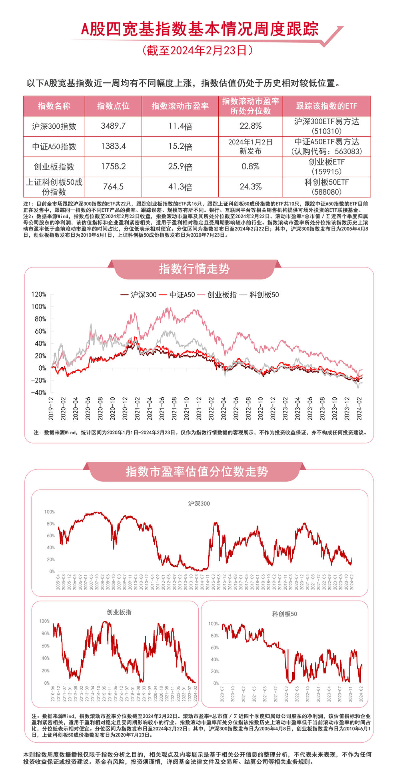 财联社2月23日电,截至周五收盘,本周沪深300指数上涨3.7%,中证A50指数上涨2.5%,创业板指数上涨1.8%,上证科创板50成份指数上涨1.7%。海通策略研究指出,从前期的调整时空和估值性价比维度综合来看A股或已在筑底,叠加近期资金面和政策面的积极因素不断积累,市场或迎来底部的第一波反弹行情。