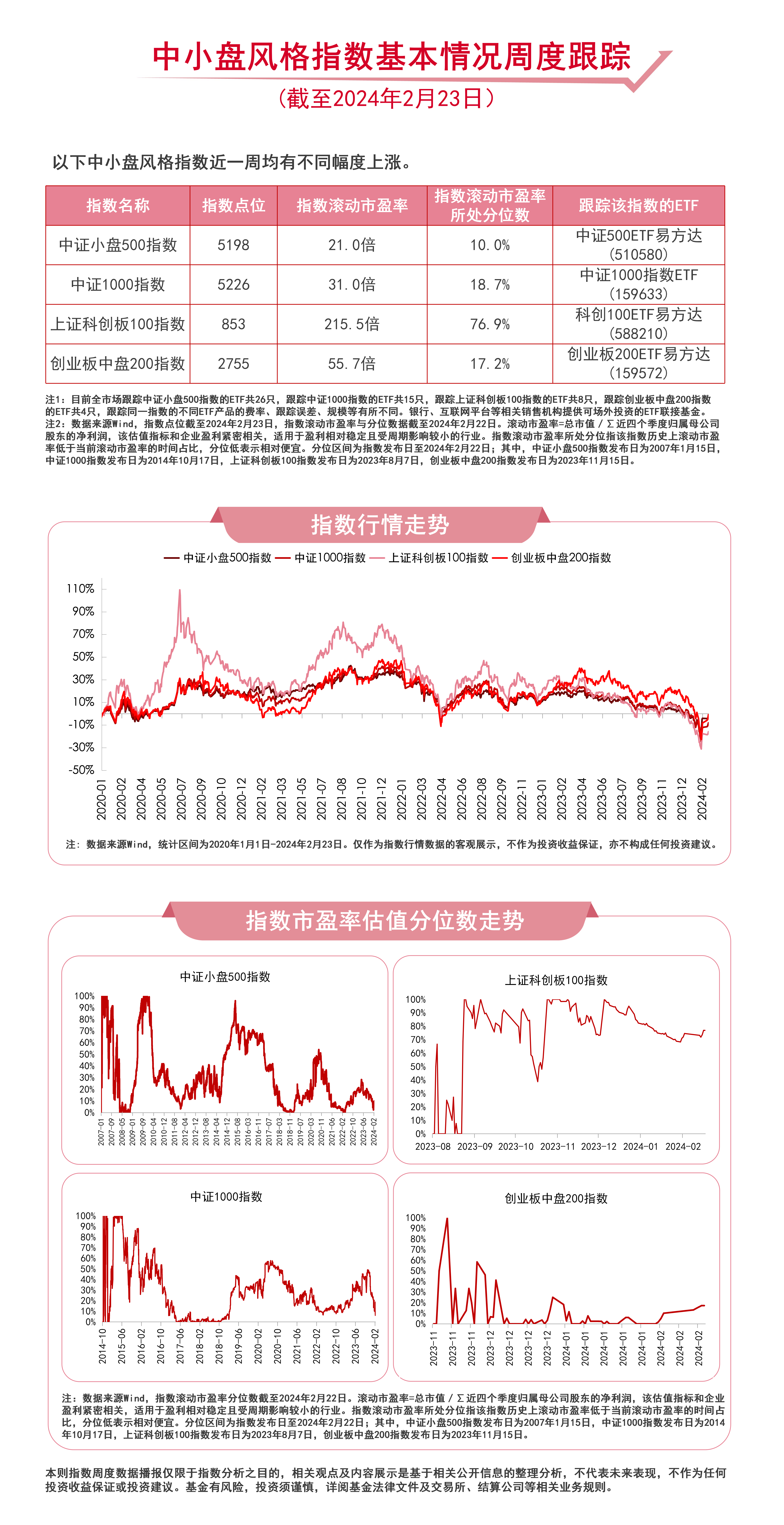 财联社2月23日电,截至周五收盘,本周中证500指数上涨0.9%,中证1000指数上涨4.7%,上证科创板100指数上涨2.1%,创业板中盘200指数上涨8.1%。国泰君安表示,近期多方政策部署活跃资本市场,宏观政策力度边际加强,市场情绪得到明显修复。复盘历史行情,反弹时中小盘往往表现出更大弹性。