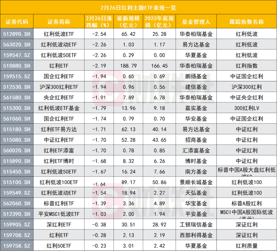 另外,还有11只红利主题ETF的复权单位净值曾在2月22日或2月23日创下各自成立以来的新高,今日在二级市场的收盘价跌超1%。