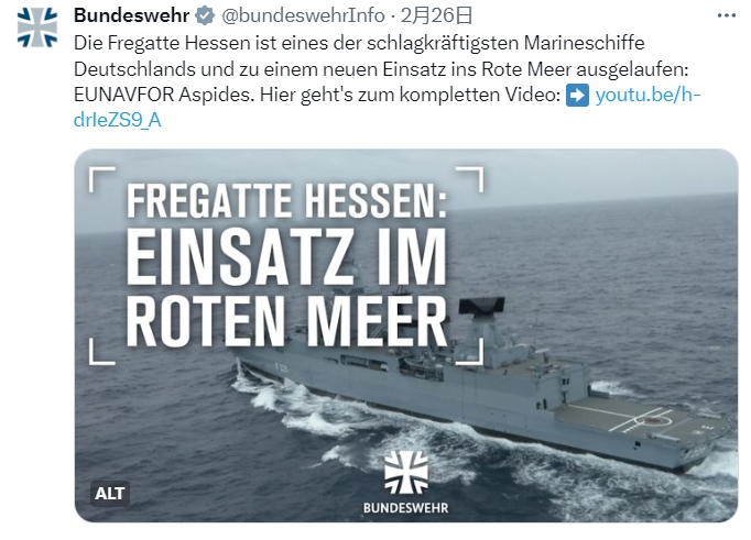 (德国联邦军周一宣布黑森号抵达红海,来源:X)