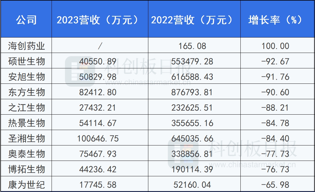 营收增速倒数10家企业分别为:海创药业(688302.SH)、硕世生物(688399.SH)、安旭生物(688075.SH)、东方生物(688298.SH)、之江生物(688317.SH)、热景生物(688068.SH)、圣湘生物(688289.SH)、奥泰生物(688606.SH)、博拓生物(688767.SH)、康为世纪(688426.SH)。