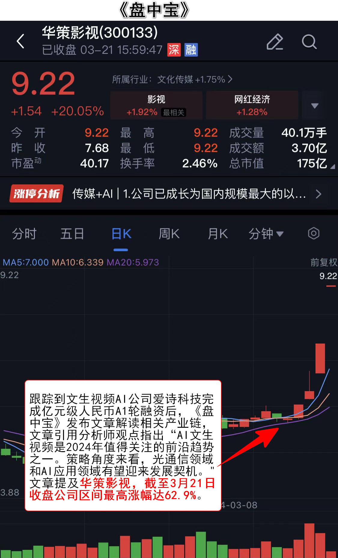 往期回顾:跟踪到文生视频AI公司爱诗科技完成亿元级人民币A1轮融资后,《盘中宝》发布文章解读相关产业链,文章引用分析师观点指出“AI文生视频是2024年值得关注的前沿趋势之一。策略角度来看,光通信领域和AI应用领域有望迎来发展契机。"文章提及华策影视,截至3月21日收盘公司区间最高涨幅达62.9%。