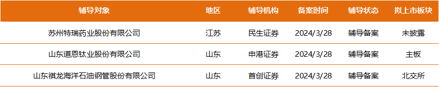 特瑞药业、道恩钛业、祺龙海洋启动A股IPO辅导。