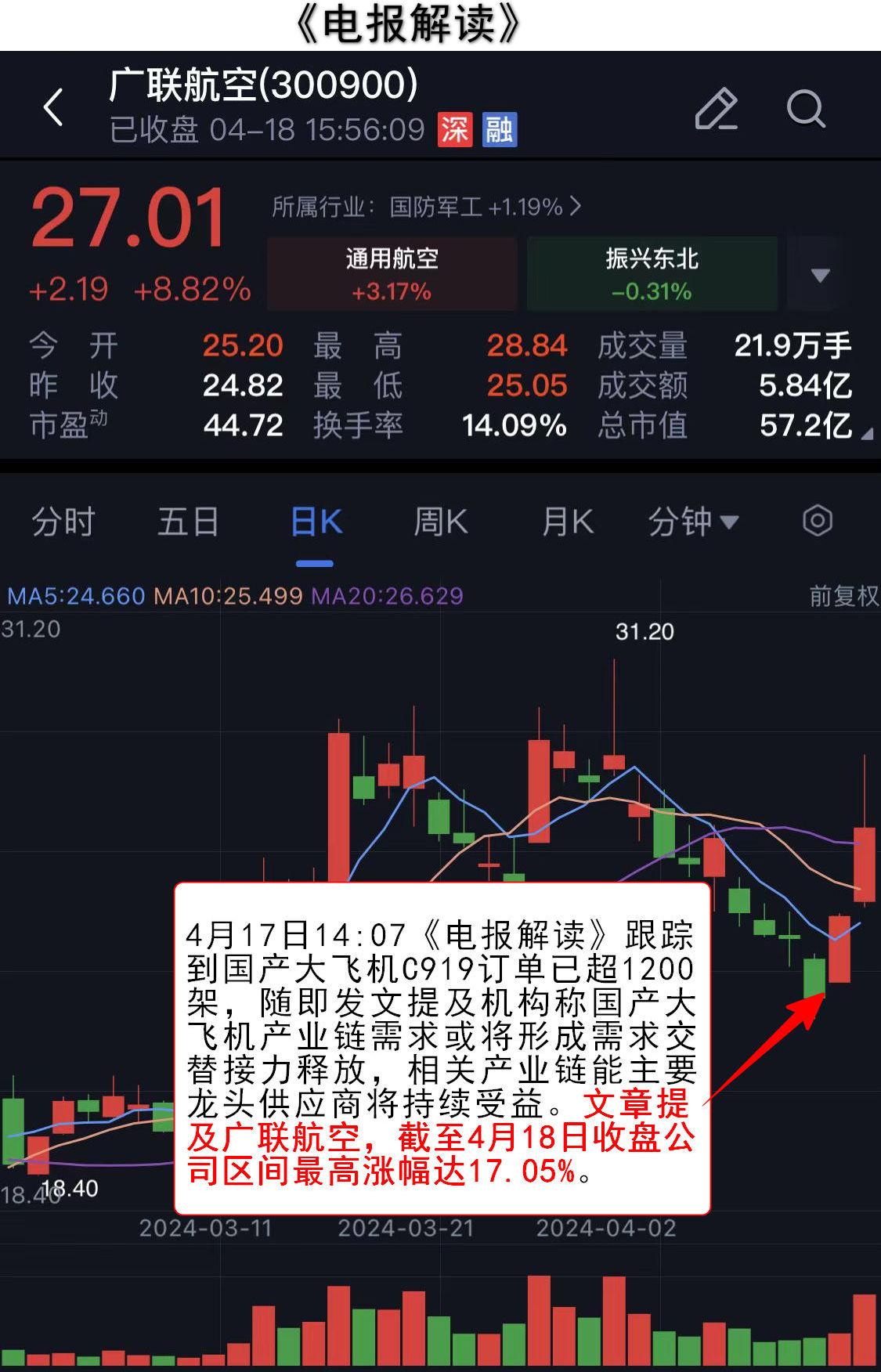 往期回顾:4月17日14:07《电报解读》跟踪到国产大飞机C919订单已超1200架,随即发文提及机构称国产大飞机产业链需求或将形成需求交替接力释放,相关产业链能主要龙头供应商将持续受益。文章提及广联航空,截至4月18日收盘公司区间最高涨幅达17.05%。