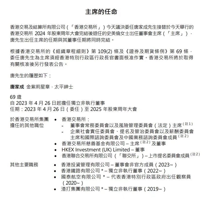 今日,港交所发布公告称,唐家成将接替史美伦担任港交所董事会主席一职。不过,根据香港交易所《组织章程细则》第109(2)条及《证券及期货条例》第69条,港交所董事会决议主席人选后,仍须经香港特区行政长官书面批准。