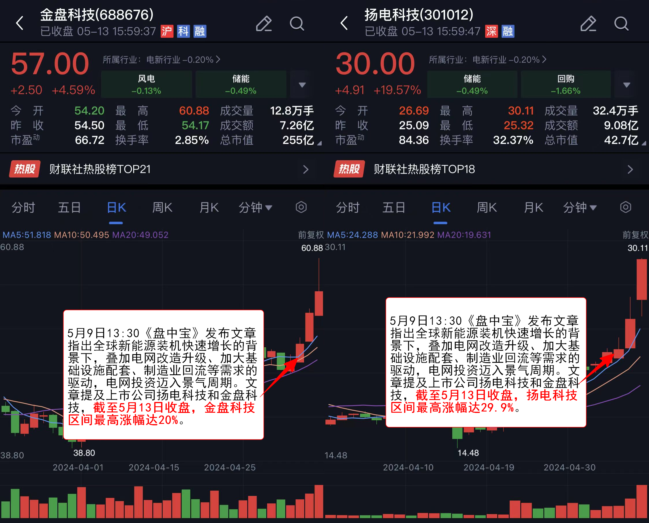 往期回顾:5月9日13:30《盘中宝》发布文章指出全球新能源装机快速增长的背景下,叠加电网改造升级、加大基础设施配套、制造业回流等需求的驱动,电网投资迈入景气周期。文章提及上市公司扬电科技和金盘科技,截至5月13日收盘,扬电科技区间最高涨幅达29.9%,金盘科技区间最高涨幅达20%。