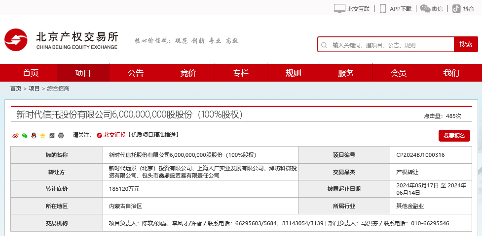 财联社记者注意到,北京产权交易所今日挂出新时代信托60亿股股份(100%股权),转让底价为18.512亿元。该转让公告的披露起止日期为5月17日至6月14日。
