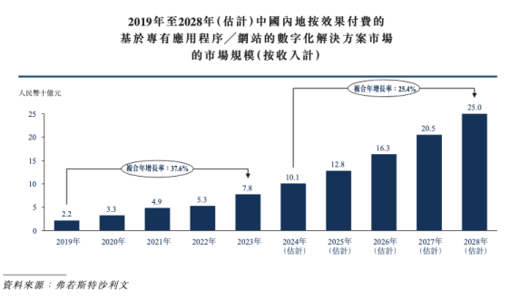 行业方面,按效果付费数字化解决方案的市场规模快速增长。根据弗若斯特沙利文报告,中国按效果付费的专有应用程序或网站的数字化解决方案市场的市场规模预计将自2024年的人民币101亿元增至2028年的人民币250亿元,复合年增长率为25.4%,市场份额预计将在2028年达到8.9%。