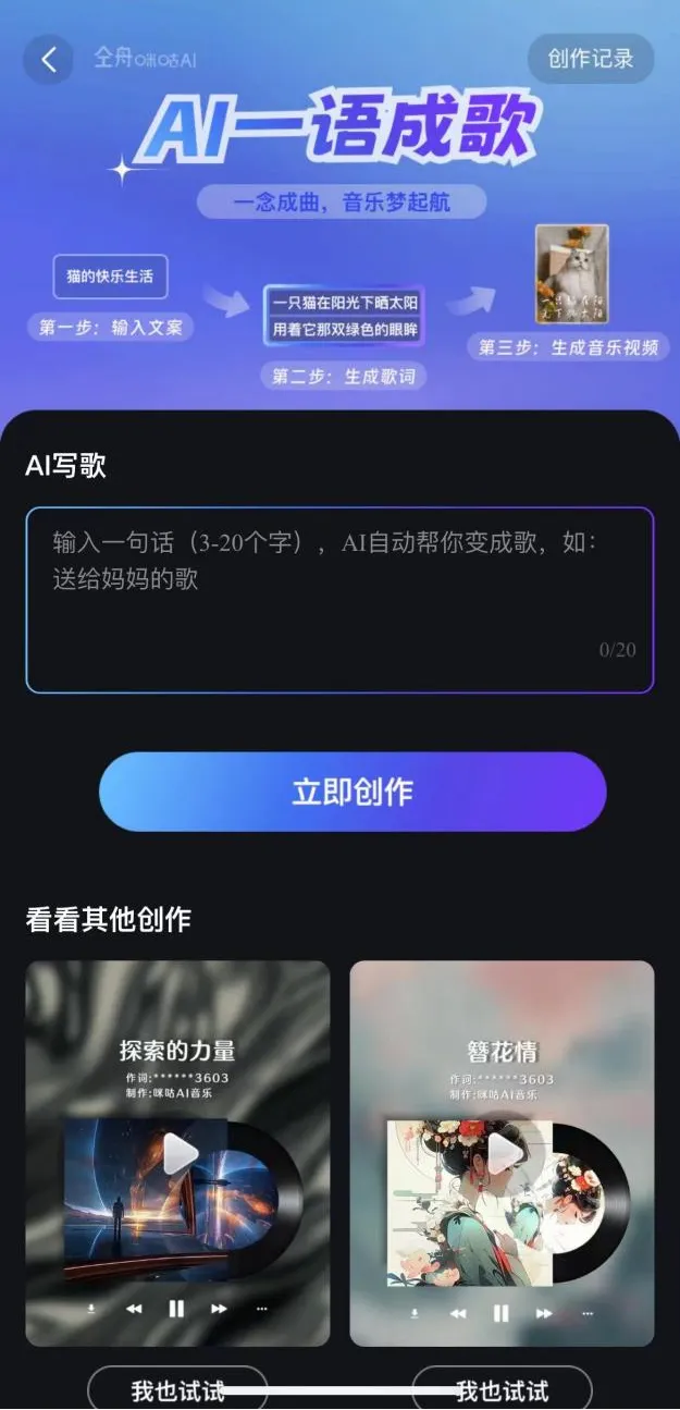 “AI一语成歌”搭载于咪咕音乐极速版APP内进行相关内容和业务体验。用户只需在APP中输入一段简单文案,AI就能自动完成高质量的词、曲、编、唱、录、混全链路音乐创作,并生成旋律悠扬、画面精美的视频彩铃。用户还可以将“AI一语成歌”所生成的音乐视频设置为视频彩铃(包括主叫视频彩铃与被叫视频彩铃)。