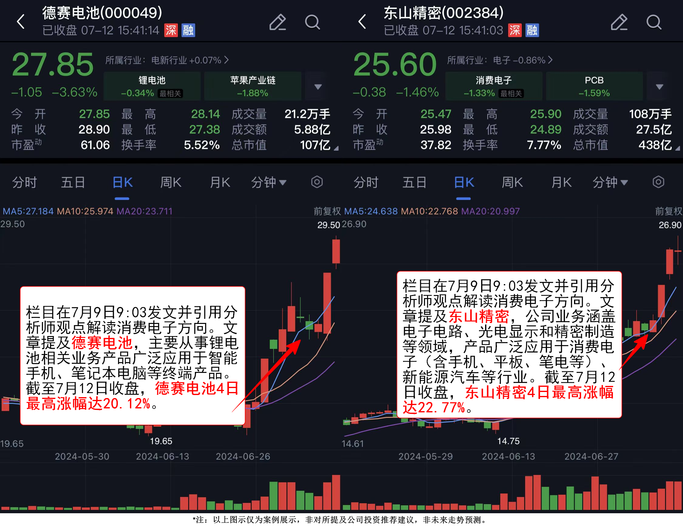 文章提及东山精密,公司业务涵盖电子电路、光电显示和精密制造等领域,产品广泛应用于消费电子(含手机、平板、笔电等)、新能源汽车等行业。此外,德赛电池主要从事锂电池相关业务,产品广泛应用于智能手机、笔记本电脑等终端产品。两家公司均持续上涨,截至7月12日收盘,东山精密4日最高涨幅达22.77%,德赛电池4日最高涨幅达20.12%。