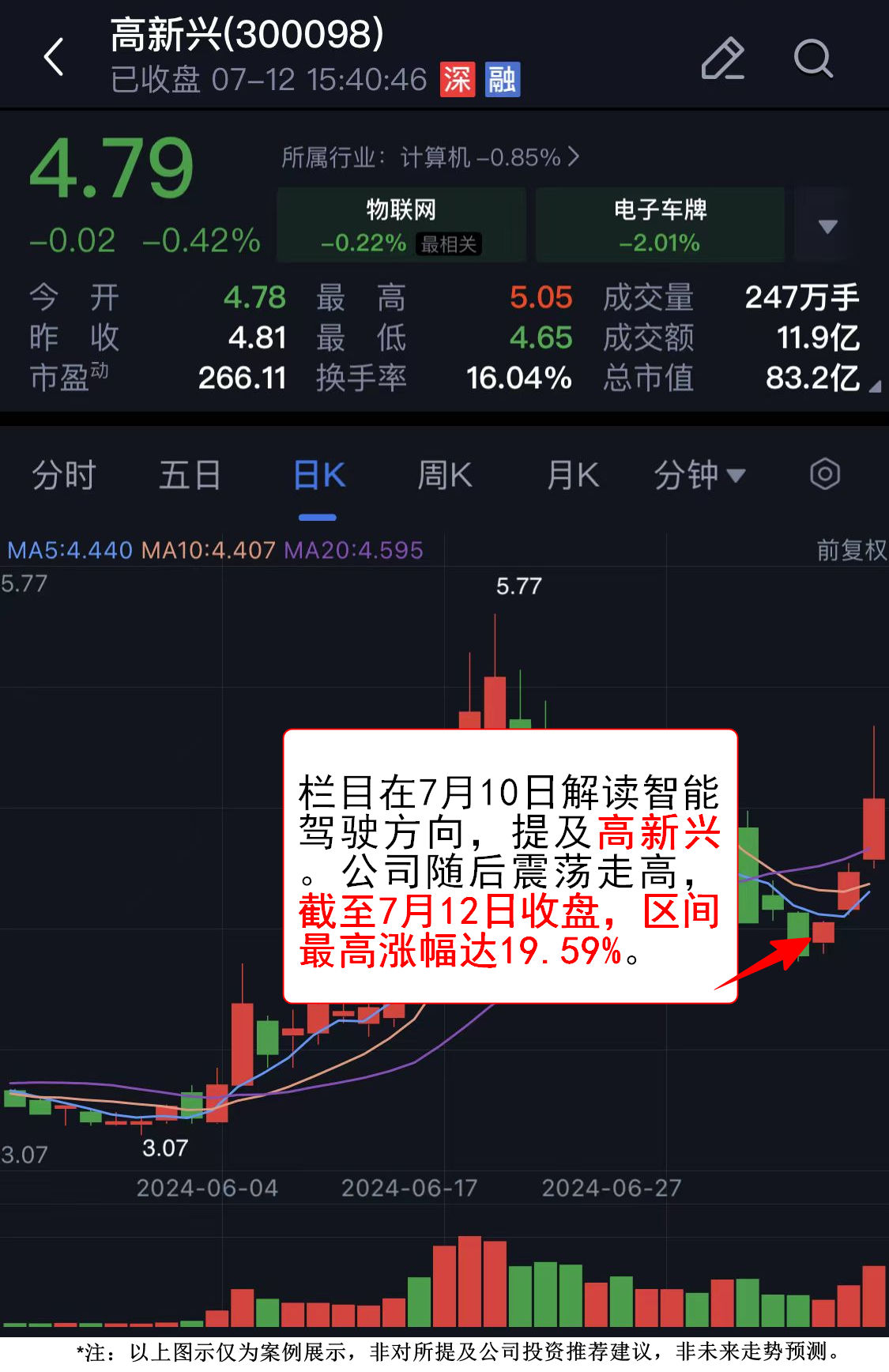 栏目在7月10日发布文章《国内唯一,该车企L4级自动驾驶进入无人化新时代》,解读智能驾驶方向,提及高新兴旗下T-BOX、车规级模组已经量产提供给多家整车主机厂(包括吉利、长安、比亚迪、广汽、一汽、红旗、现代等)。公司随后震荡走高,截至7月12日收盘,区间最高涨幅达19.59%。