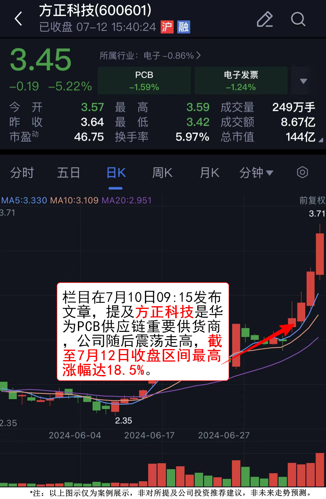 上市公司中,方正科技是华为PCB供应链重要供货商,深度受益于华为全系列崛起,主要产品包括高密度互联板、多层板(2-56层)、软硬结合板和其他个性化定制PCB等。公司随后震荡走高,截至7月12日收盘区间最高涨幅达18.5%。