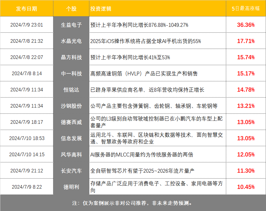 近期《电报解读》梳理出消费电子、存储芯片等方向。其中,7月9日23:01《电报解读》梳理出生益电子的业绩公告,公司2024年半年度实现归属于母公司所有者的净利润9350万元到1.1亿元,同比增长876.88%-1049.27%。文中指出其业绩增长背后的原因是:市场对高层数、高精度、高密度和高可靠的多层印制电路板需求增长,公司产量、销量、营业收入均较上年同期有所增长。生益电子随后震荡走高,截至7月12日收盘,区间最高涨幅达36.36%。