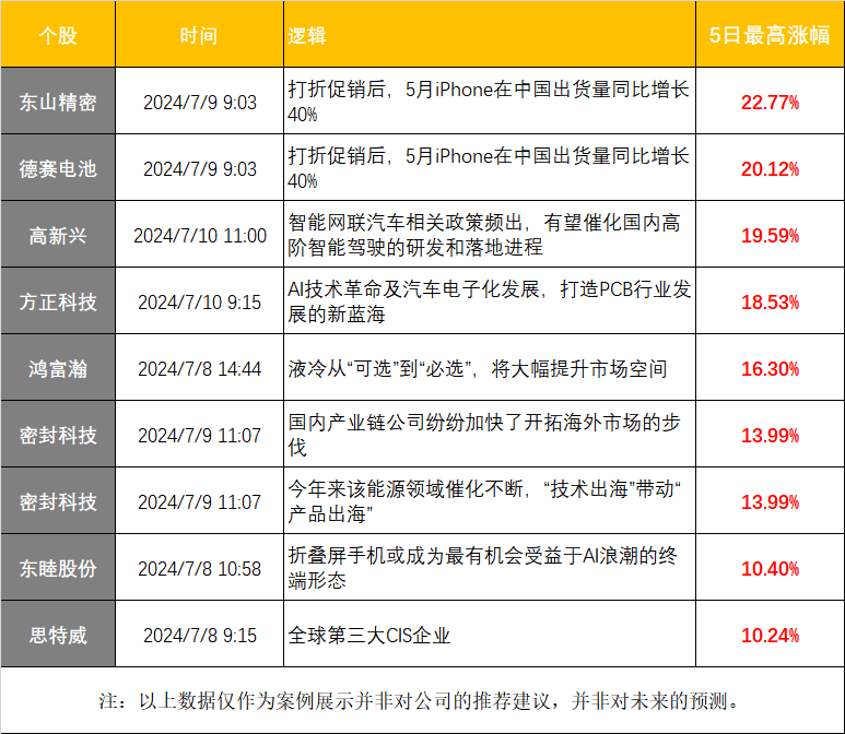 往期回顾:近期《盘中宝》发文解读消费电子、智能驾驶等方向。其中,7月9日9:03《盘中宝》跟踪到“苹果美股周一盘中创下52周新高点,超越微软重新夺回市值第一宝座”随即发文并引用券商观点指出:在消费电子需求复苏,AI手机进入原生化阶段的背景下,以苹果为引领者的AI手机时代将加速到来,一方面,手机端芯片零部件升级驱动AI手机产业链量价齐升;另一方面,联动其他AI智能终端带来更为丰富的体验,协同效应更为明显。文章提及东山精密,公司4日最高涨22.77%。