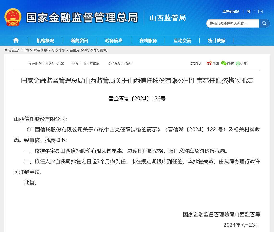 昨日,国家金融监督管理总局山西监管局发布了山西信托股份有限公司牛宝亮任职资格的批复。该局表示,核准牛宝亮山西信托股份有限公司董事、总经理任职资格。聘任文件应及时抄报该局。拟任人应自山西监管局批复之日起3个月内到任,未在规定期限内到任的,本批复失效,由该局办理行政许可注销手续。