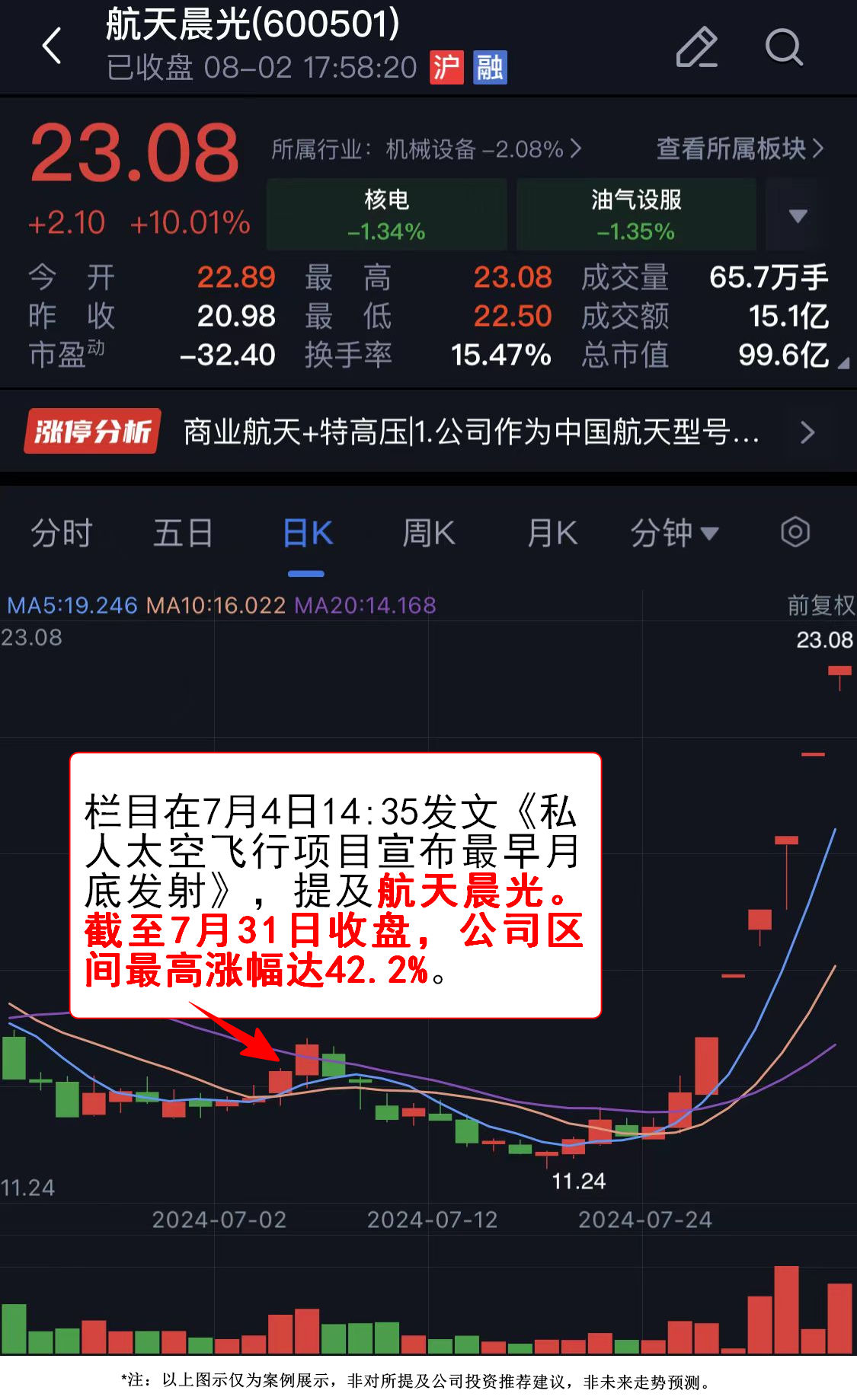 文章提及航天晨光,公司主要为航天发射任务配套金属软管。近年来公司研发的发动机用金属软管、箭体增压管路用金属软管、航天伺服机构用金属软管等核心产品,为国家多项航天任务的完成提供了保障。截至7月31日收盘,公司区间最高涨幅达42.2%。