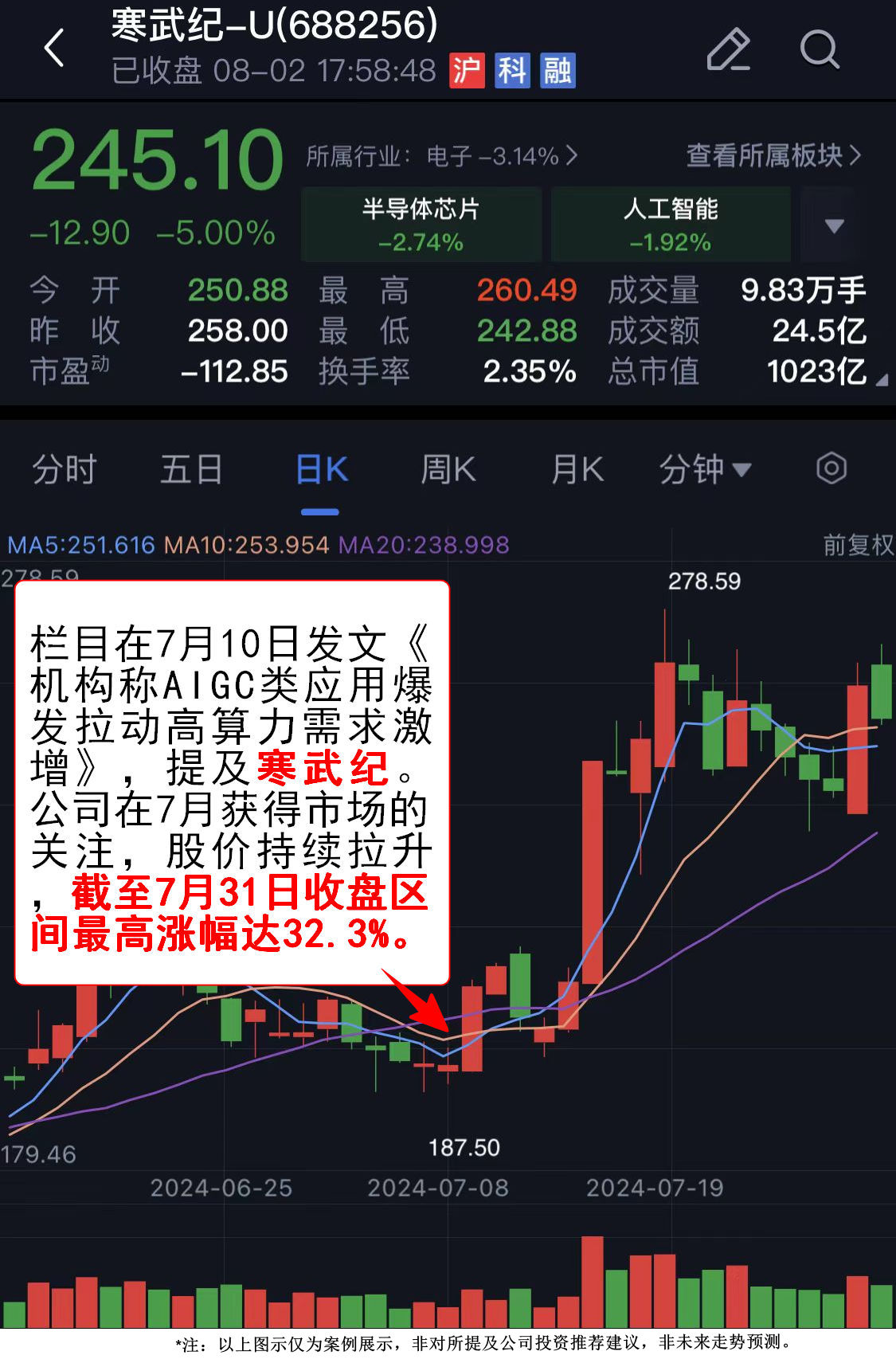 上市公司中,寒武纪专注于人工智能芯片产品的研发与技术创新,致力于打造人工智能领域的核心处理器芯片,是同时具备人工智能推理和训练智能芯片产品的企业。公司在7月获得市场的关注,股价持续拉升,截至7月31日收盘区间最高涨幅达32.3%。