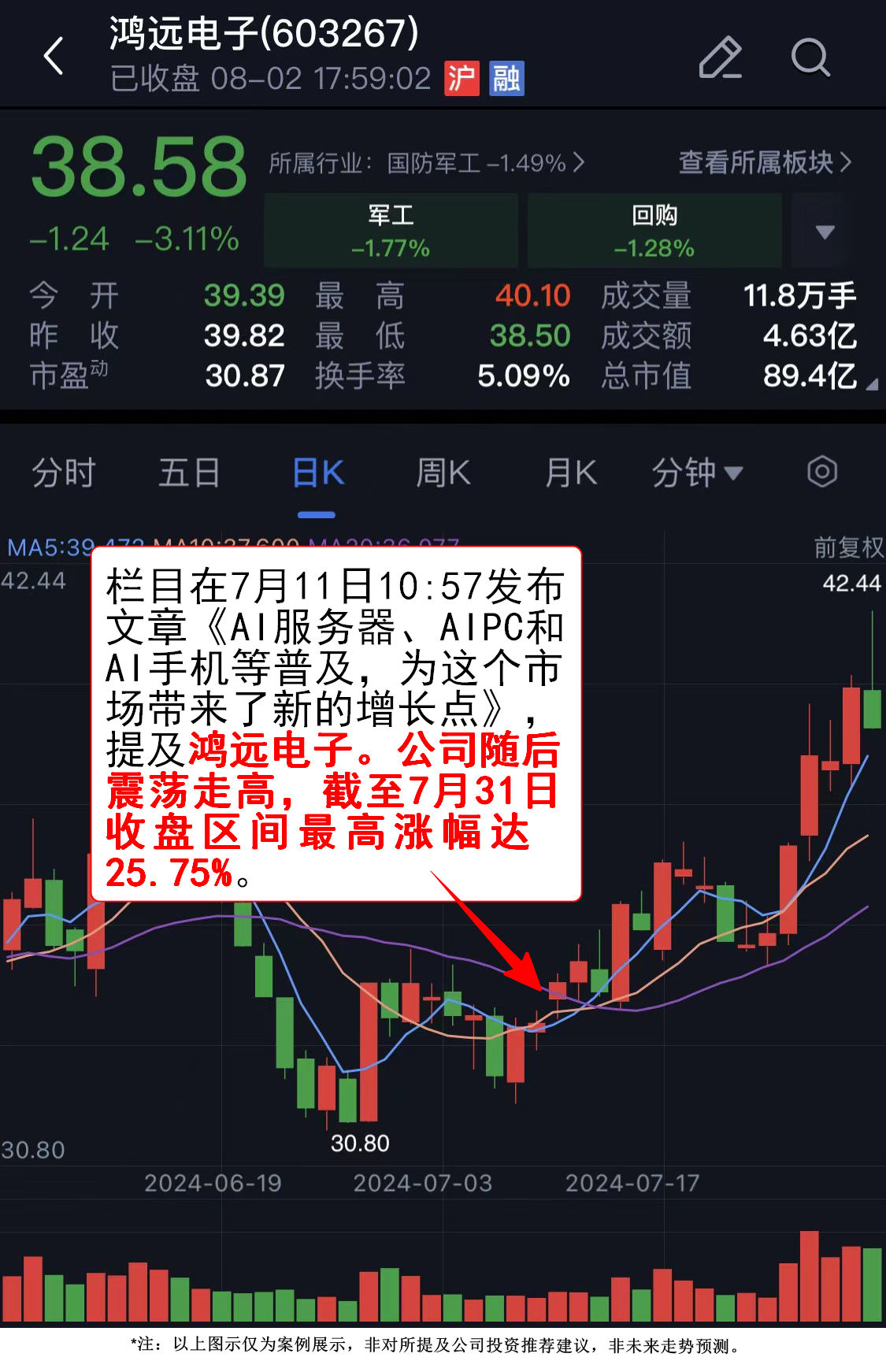 鸿远电子随后震荡走高,截至7月31日收盘区间最高涨幅达25.75%。