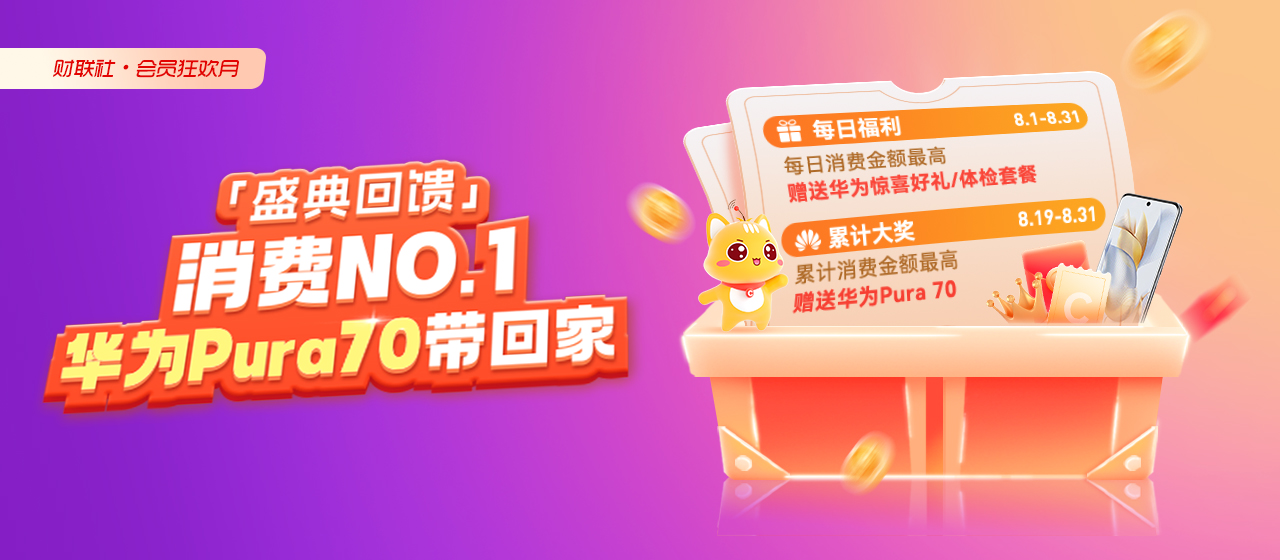 消费冲刺金榜,天天冲榜抢惊喜好礼!8月19日-8月31日期间,累计金额“TOP1”即可获赠华为最新旗舰pura70智能手机。