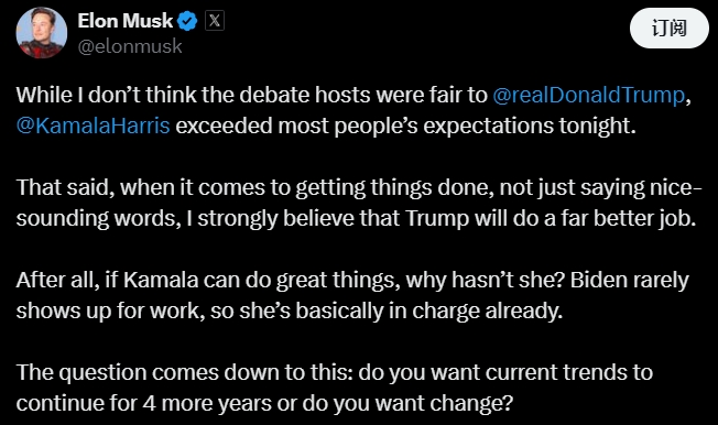 世界首富、特朗普狂热拥趸马斯克也公开承认,哈里斯的表现要比预期更好,并没有多提特朗普的表现。
