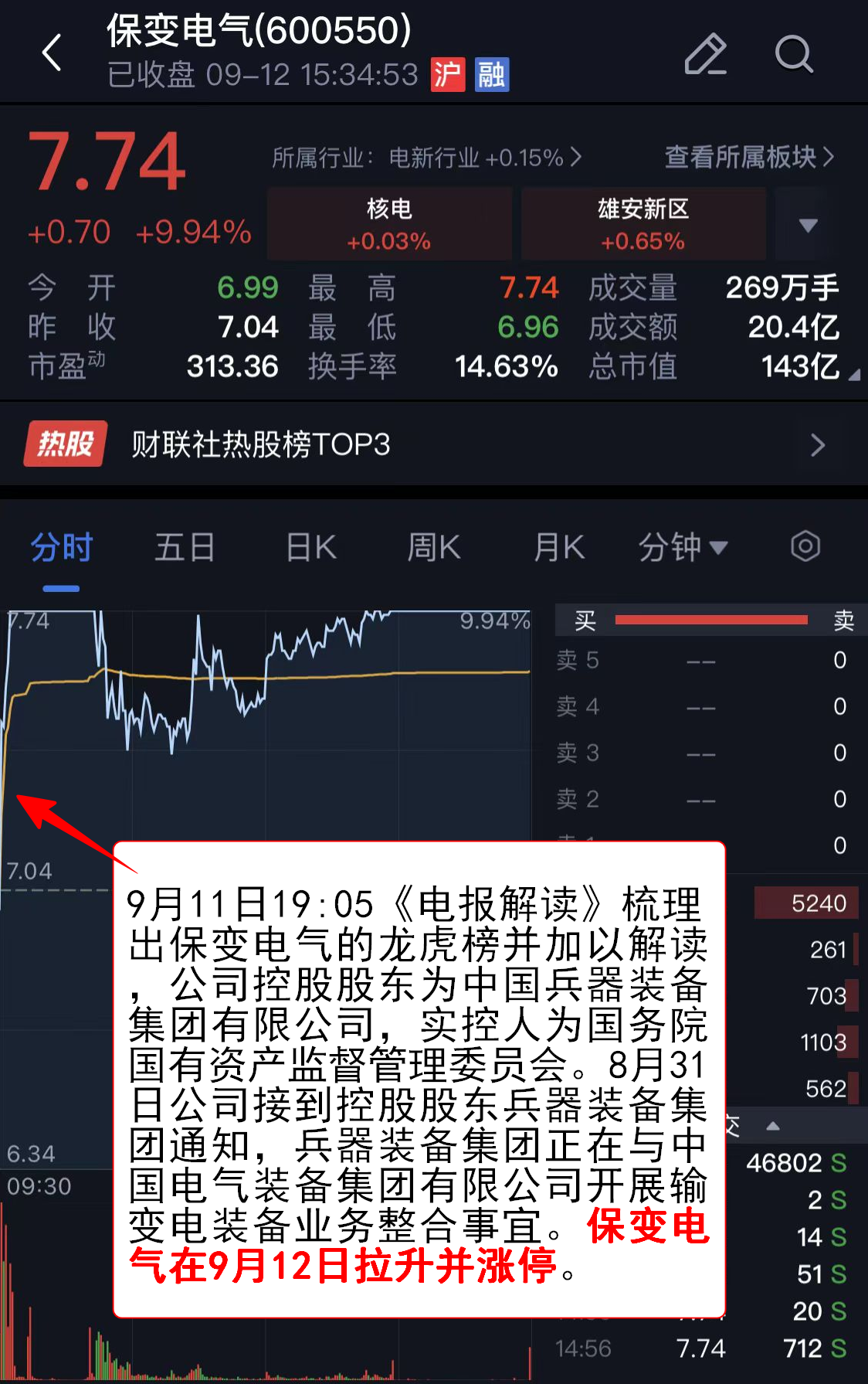 9月11日19:05《电报解读》梳理出保变电气的龙虎榜并加以解读,公司控股股东为中国兵器装备集团有限公司,实控人为国务院国有资产监督管理委员会。8月31日公司接到控股股东兵器装备集团通知,兵器装备集团正在与中国电气装备集团有限公司开展输变电装备业务整合事宜。保变电气在9月12日拉升并涨停。