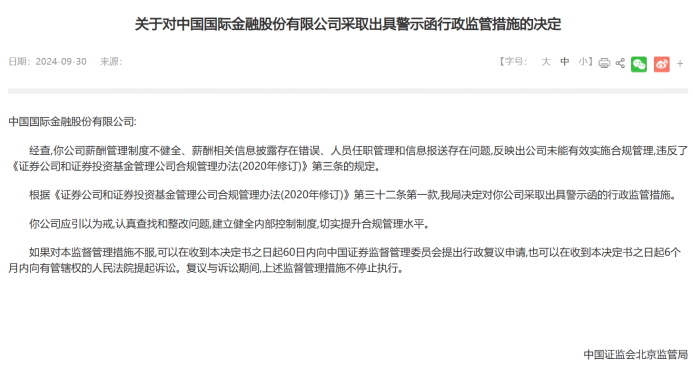 财联社9月30日讯(记者 林坚)近年来,券商薪酬反复受到高度关注,关注点既包括限薪与降薪,又包括薪酬激励方式,这类关注也在监管的视域下,已有不少罚单下发。今年国庆节假期前最后一个交易日,9月30日, 北京证监局官方挂出一则罚单,称中金公司薪酬管理制度不健全、薪酬相关信息披露存在错误、人员任职管理和信息报送存在问题,因此对公司发出警示函。
