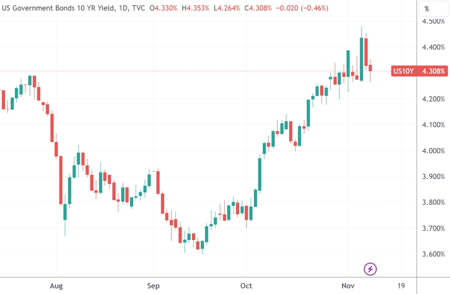 (十年期美债收益率上冲4.5%后回落,来源:TradingView)