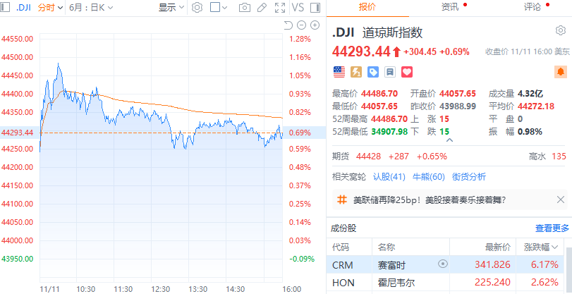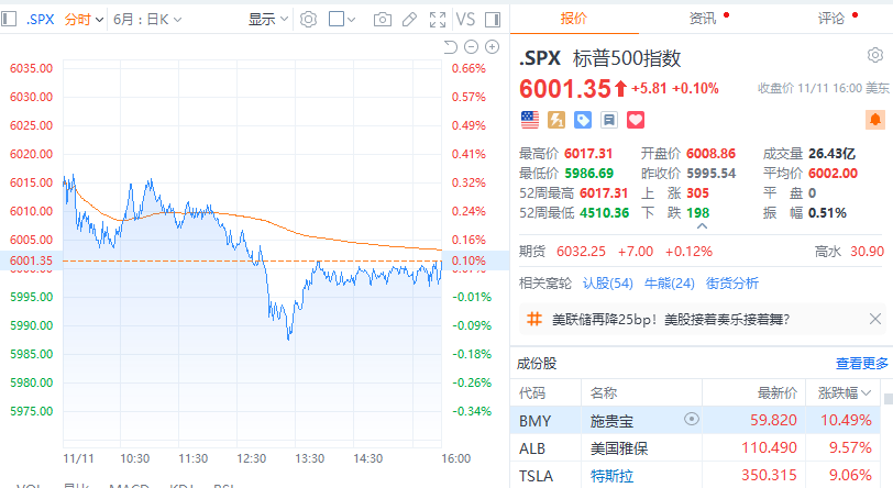 财联社11月12日电,美股三大指数集体收涨,道指涨0.69%,标普500指数涨0.1%,纳指涨0.06%;均续创历史新高,标普500指数首次收于6000点上方。特斯拉涨约9%,创下四年来最大五日涨幅,总市值1.12万亿美元,升至美股第七位。奈飞、谷歌涨超1%;英特尔跌超4%,苹果、英伟达、微软、Meta跌超1%,亚马逊小幅下跌。加密货币概念股大涨,嘉楠科技涨超41%,MicroStrategy涨超25%,Coinbase涨超19%。