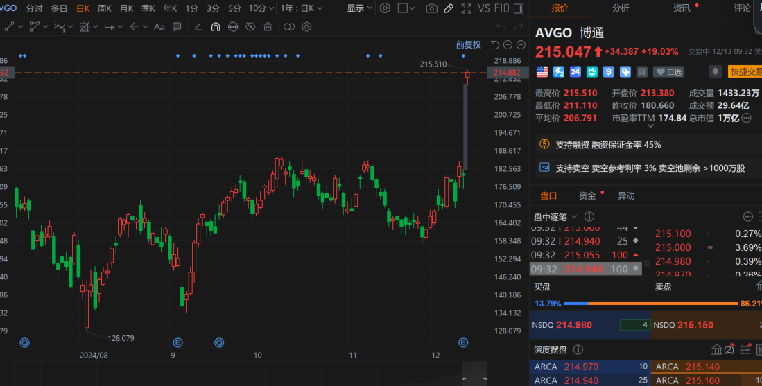 财联社12月13日电,博通盘初涨超18%,总市值升至1万亿美元,公司Q4利润超预期,全财年AI收入翻倍大涨220%。