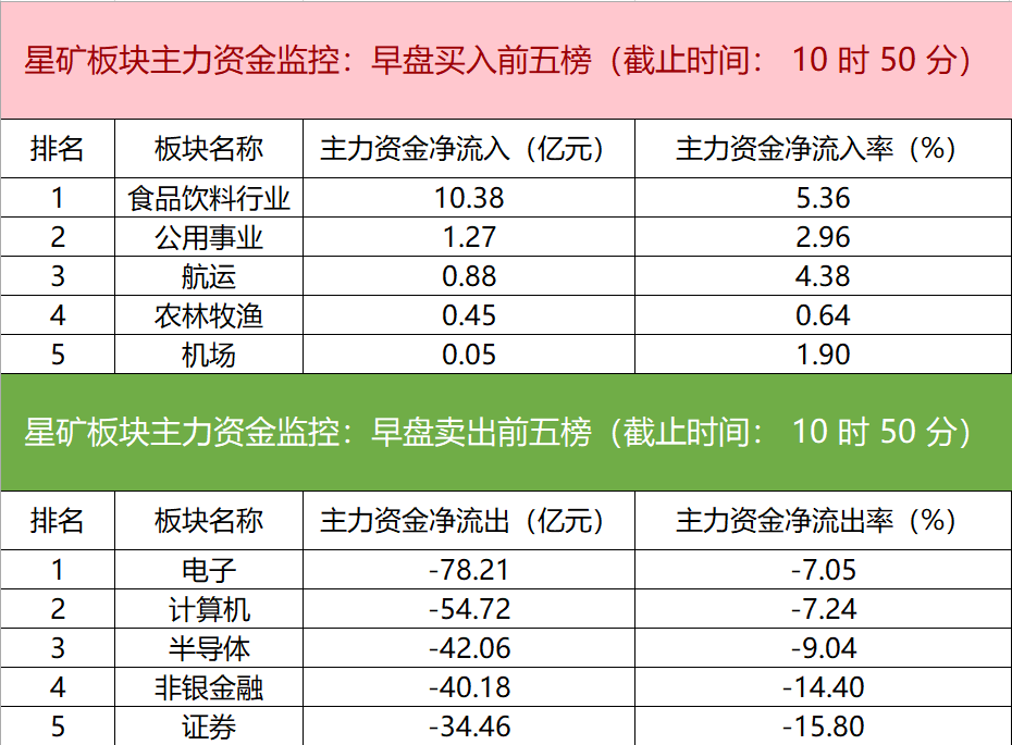 财联社12月31日电,财联社星矿数据显示,今日早盘主力资金净流入食品饮料行业、公用事业、航运等板块,净流出电子、计算机、半导体等板块,其中电子板块净流出超78亿元。个股方面,闻泰科技涨停,主力资金净买入5.64亿元位居首位,建设工业、贵州茅台、国星光电获主力资金净流入居前;东方财富遭净卖出超13亿元,中际旭创、中芯国际、通富微电主力资金净流出额居前。
