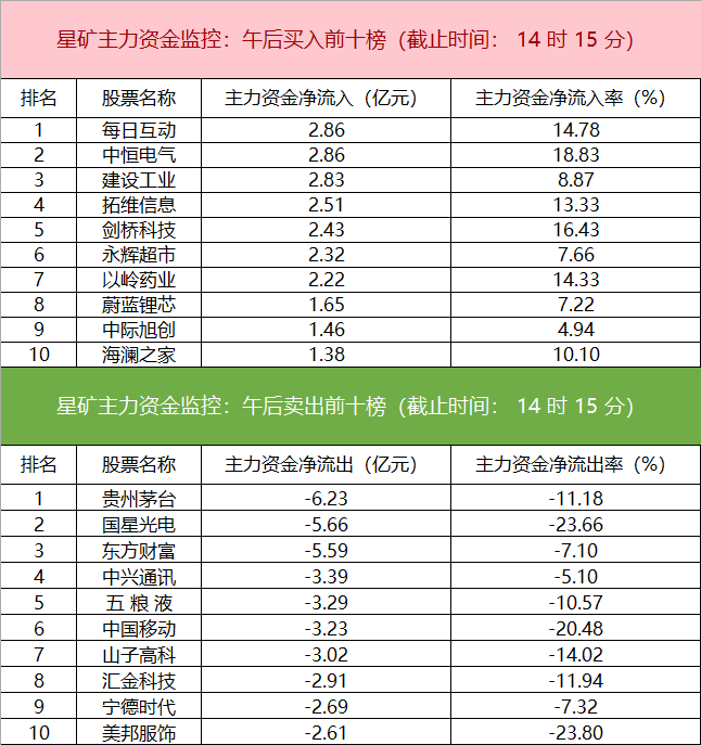 财联社1月6日电,财联社星矿数据显示,今日主力资金净流入有色金属、钢铁、石油石化等板块,净流出电子、计算机、机械设备等板块,其中电子板块净流出49.95亿元。个股方面,每日互动大涨,主力资金净流入2.86亿元居首位,中恒电气、建设工业、拓维信息获主力资金净流入居前;贵州茅台遭净卖出6.23亿元居净流出首位,国星光电、东方财富、中兴通讯等主力资金净流出额居前。