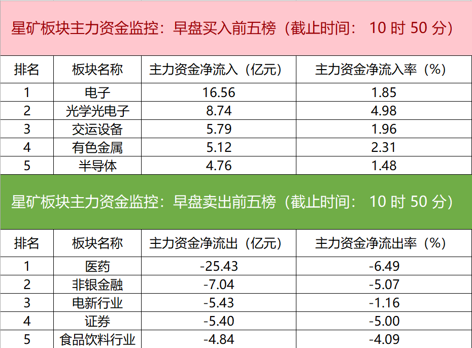 财联社1月7日电,财联社星矿数据显示,今日早盘主力资金净流入电子、光学光电子、交运设备等板块,净流出医药、非银金融、电新行业等板块,其中医药板块净流出超25亿元。个股方面,利欧股份涨停,主力资金净买入4.63亿元位居首位,京东方A、山子高科、TCL科技获主力资金净流入居前;鲁抗医药遭净卖出超6亿元,东方财富、宁德时代、中芯国际主力资金净流出额居前。