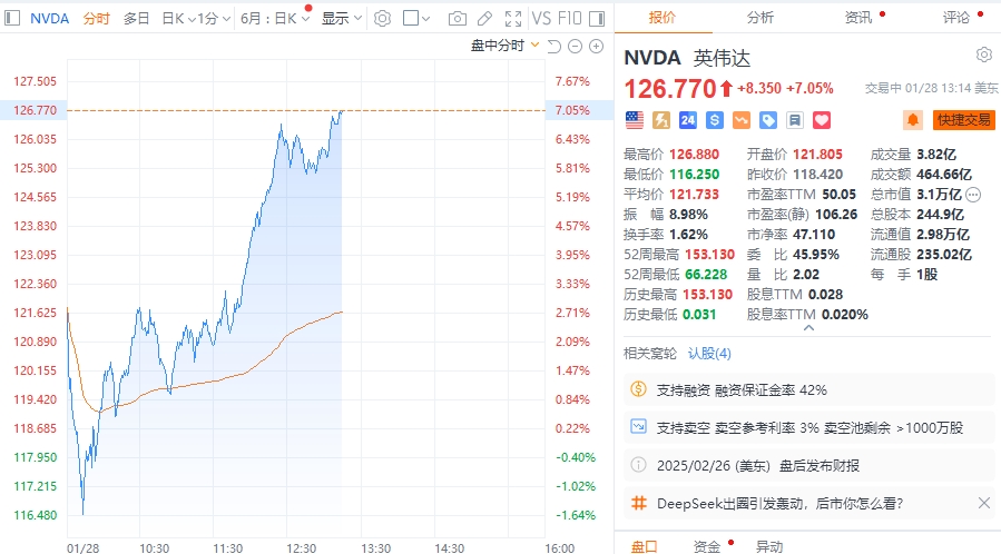 财联社1月29日电,英伟达涨幅扩大至7%,报126.77美元/股。