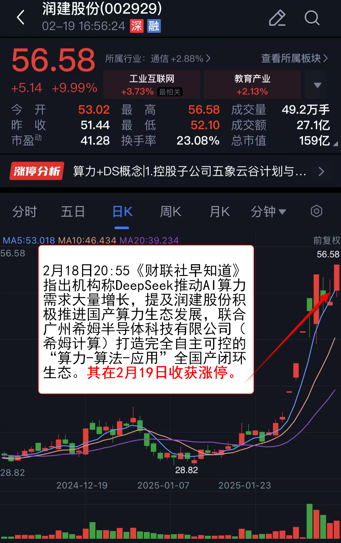 2月18日20:55《财联社早知道》指出机构称DeepSeek推动AI算力需求大量增长,提及润建股份积极推进国产算力生态发展,联合广州希姆半导体科技有限公司(希姆计算)打造完全自主可控的“算力-算法-应用”全国产闭环生态。其在2月19日收获涨停。