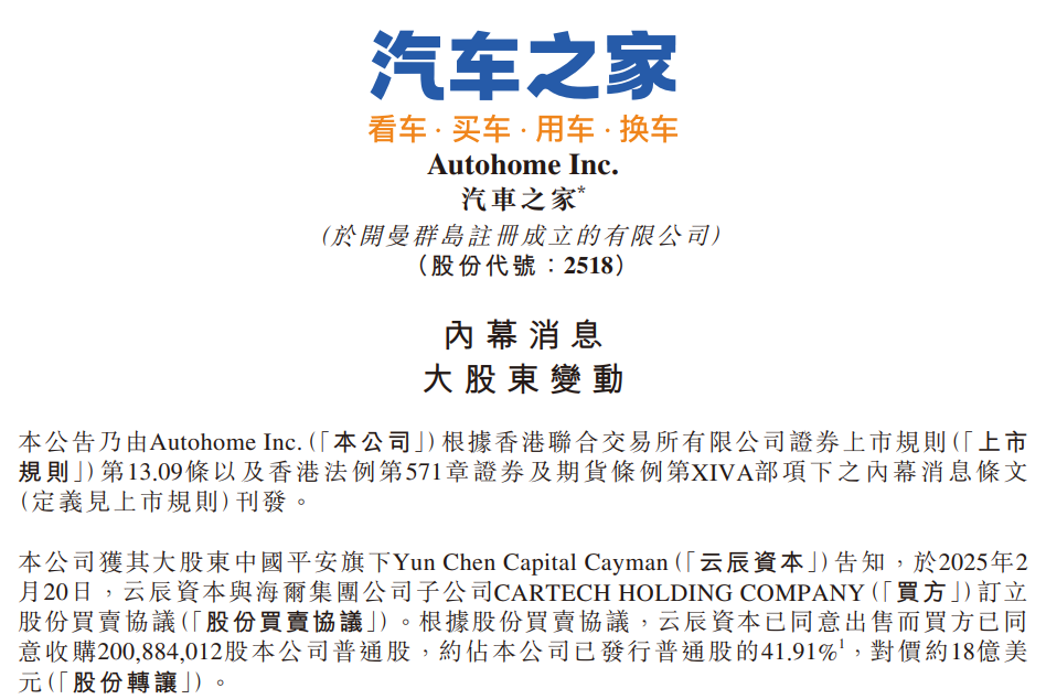 财联社2月20日电,汽车之家(02518.HK)在港交所发布公告称,公司获其大股东中国平安旗下云辰资本告知,当日云辰资本与海尔集团公司子公司CARTECH HOLDING COMPANY(买方)订立股份买卖协议。根据协议,云辰资本已同意出售而买方已同意收购200,884,012股公司普通股,约占公司已发行普通股的41.91%,对价约18亿美元。