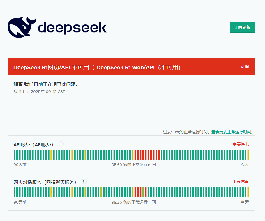 00:29:11 财联社3月11日电,DeepSeek网页显示,正在调查有关DeepSeek R1网络/API服务不可用的问题。