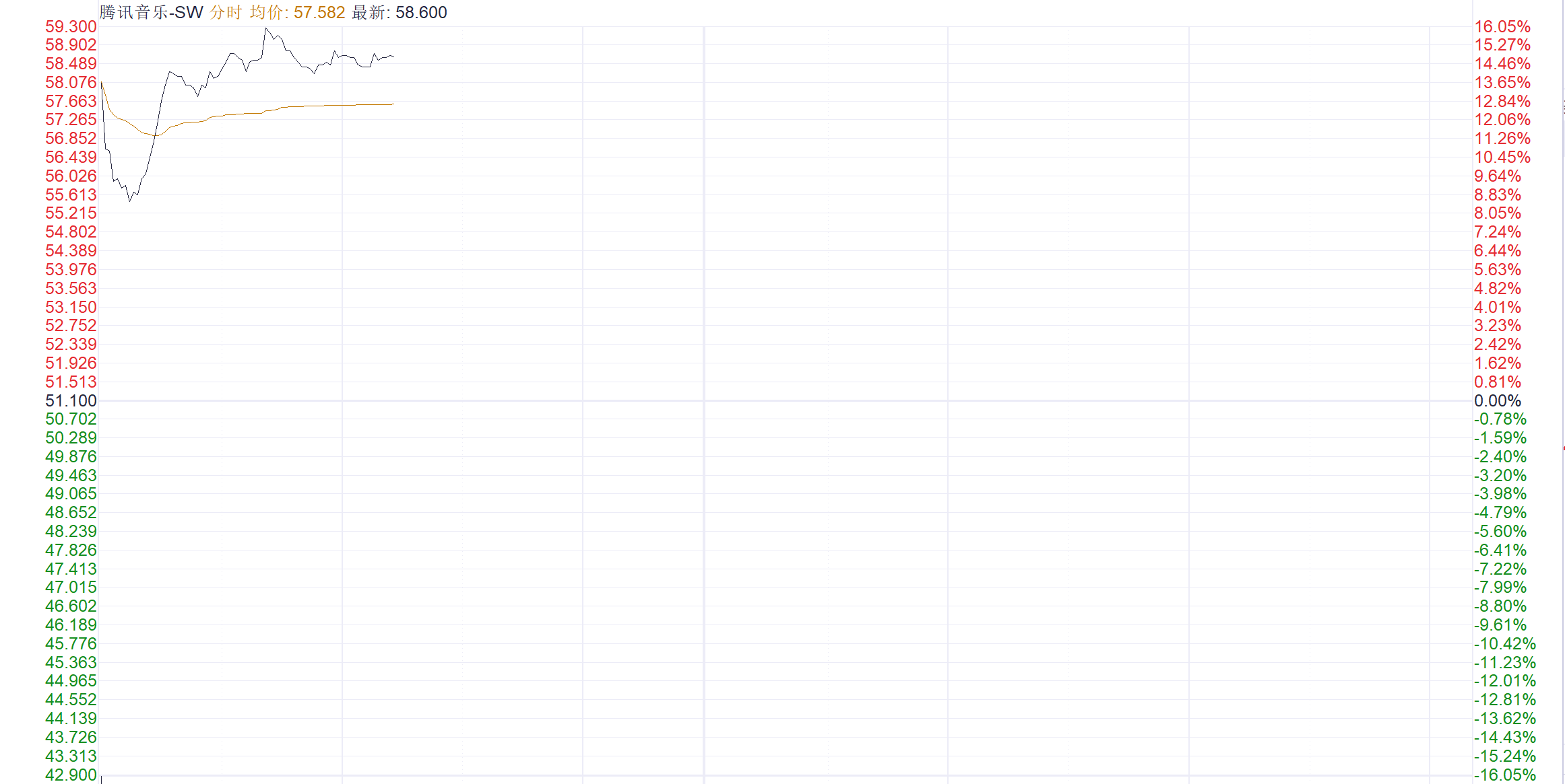 财联社3月19日讯(编辑 胡家荣)腾讯音乐-SW(01698.HK)今日财报发布后股价强势拉升,盘中一度涨近16%。截至发稿,涨14.67%,报58.60港元。