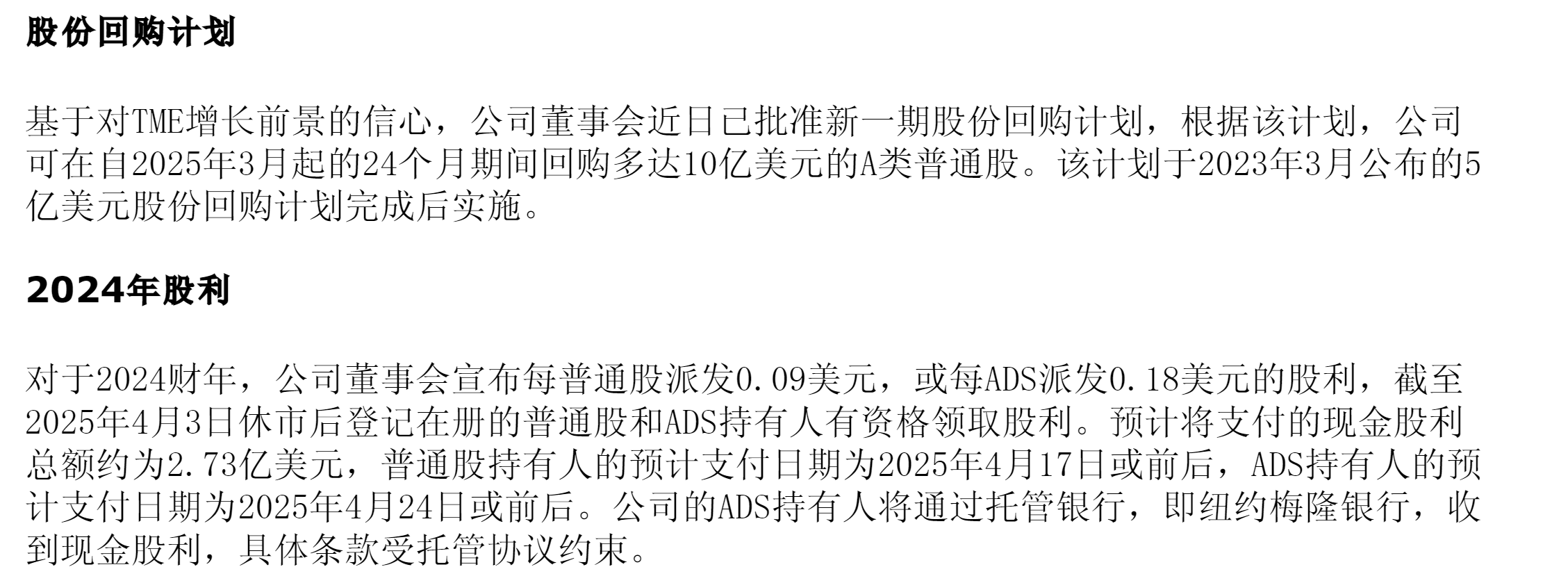 公告还指出,基于充沛现金流(截至2024年底现金储备达375.8亿元),腾讯音乐宣布两项关键举措: