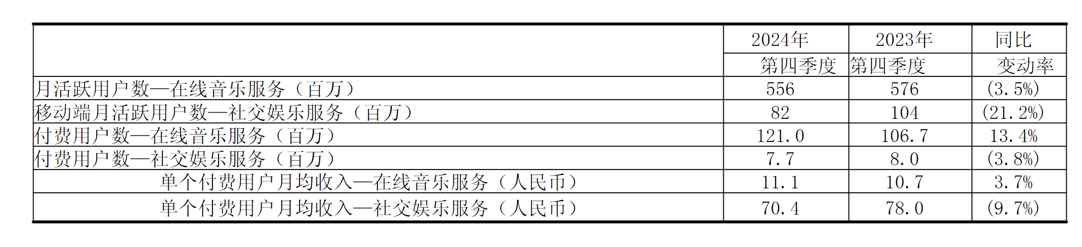 从整体收入来看,在线音乐服务收入达217.42亿元,同比增长25.5%,占总收入比重提升至76.5%。其中,订阅收入152.3亿元,同比增长25.9%,主要得益于付费用户规模扩大及用户付费能力提升:截至2024年底,在线音乐付费用户数达1.21亿,同比增长13.4%;单个用户月均收入从10.7元增至11.1元。