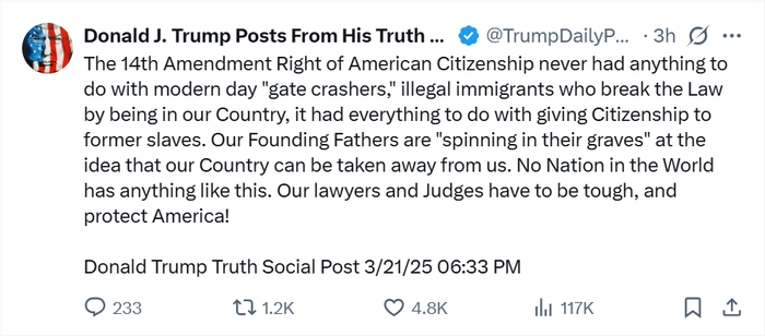 财联社3月22日电,当地时间3月21日,美国总统特朗普在其社交媒体上表示,宪法第十四修正案赋予的美国公民权与非法移民无关,这些人违反法律进入美国。特朗普指出,如果美国的开国元勋得知国家正面临这样的状况,一定会“在坟墓中感到愤怒”。他还称,世界上没有任何一个国家存在这样的情况。特朗普强调,美国的律师和法官必须采取强硬态度,保护国家。