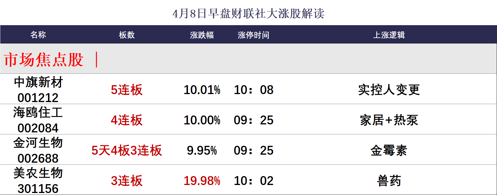 财联社4月8日电,今日午盘全市场共79股涨停,连板股总数14只,13股封板未遂,封板率为86%(不含ST股、退市股)。焦点股方面,中旗新材T字涨停晋级5连板,兽药板块金河生物5天4板,美农生物20CM3连板。