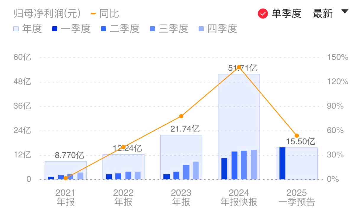 财联社4月9日电,中际旭创(300308.SZ)公告称,预计2025年第一季度归属于上市公司股东的净利润14亿元-17亿元,比上年同期增加38.71%-68.44%。报告期内,得益于终端客户对算力基础设施的持续建设、资本开支强劲增长带来800G和400G高端光模块销售的大幅增加,产品结构持续优化,公司营业收入和净利润同比得到大幅提升。小财注:2024年Q4净利14.18亿元,据此计算,预计Q1净利环比变动为-1.27%至19.89%。