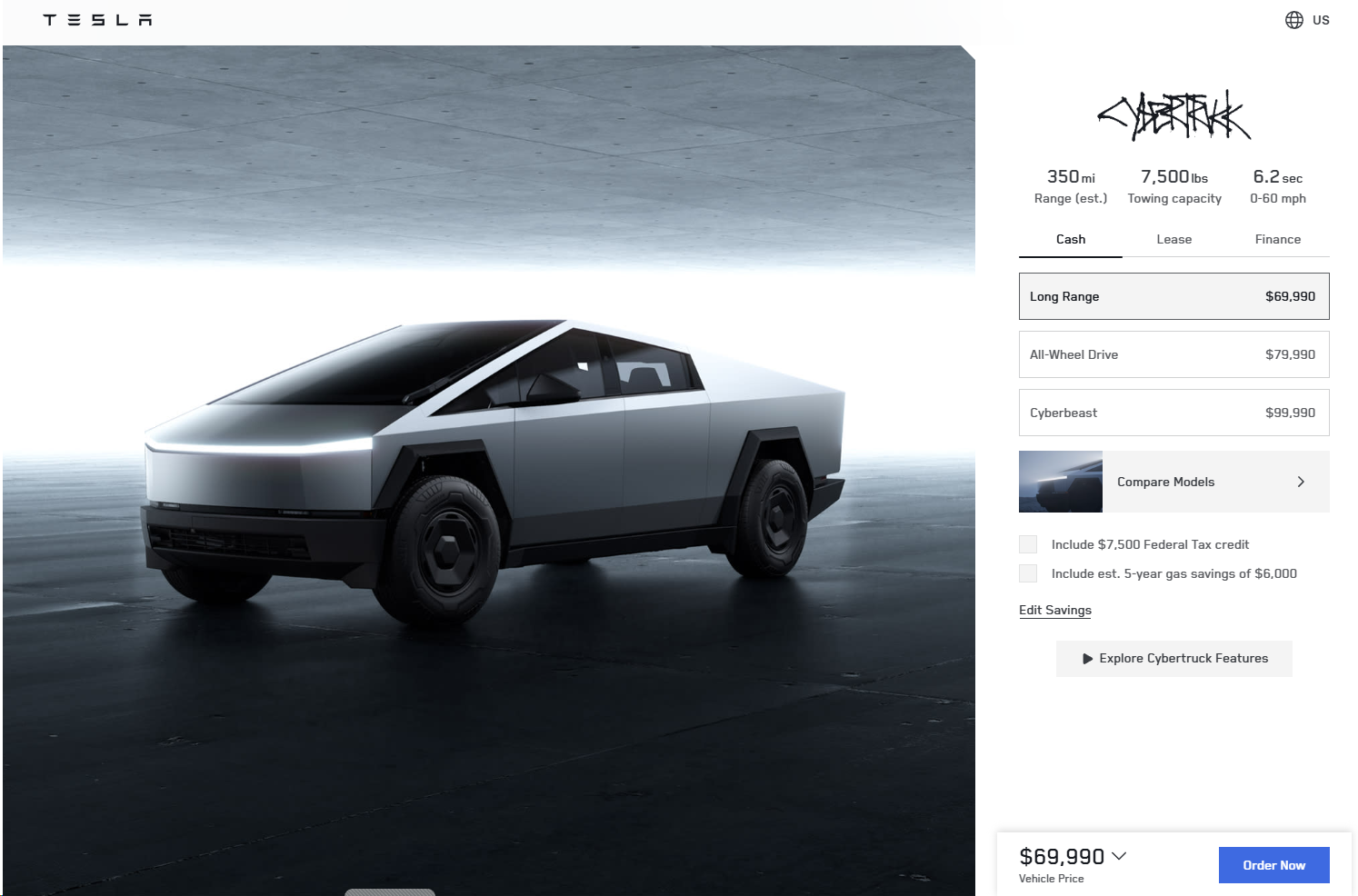 10:21:37 财联社4月11日电,特斯拉官网显示,特斯拉在美国推出CyberTruck长续航版,定价为69990美元。
