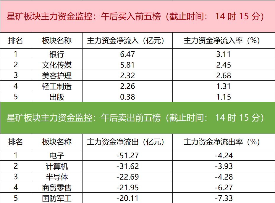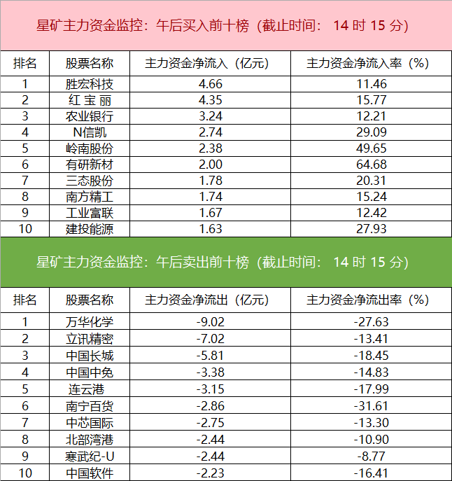 财联社4月15日电,财联社星矿数据显示,今日主力资金净流入银行、文化传媒、美容护理等板块,净流出电子、计算机、半导体等板块,其中电子板块净流出超51亿元。个股方面,胜宏科技上涨,主力资金净买入4.66亿元位居首位,红宝丽、农业银行、N信凯主力资金净流入居前;万华化学遭净卖出超9亿元位居首位,立讯精密、中国长城、中国中免主力资金净流出额居前。