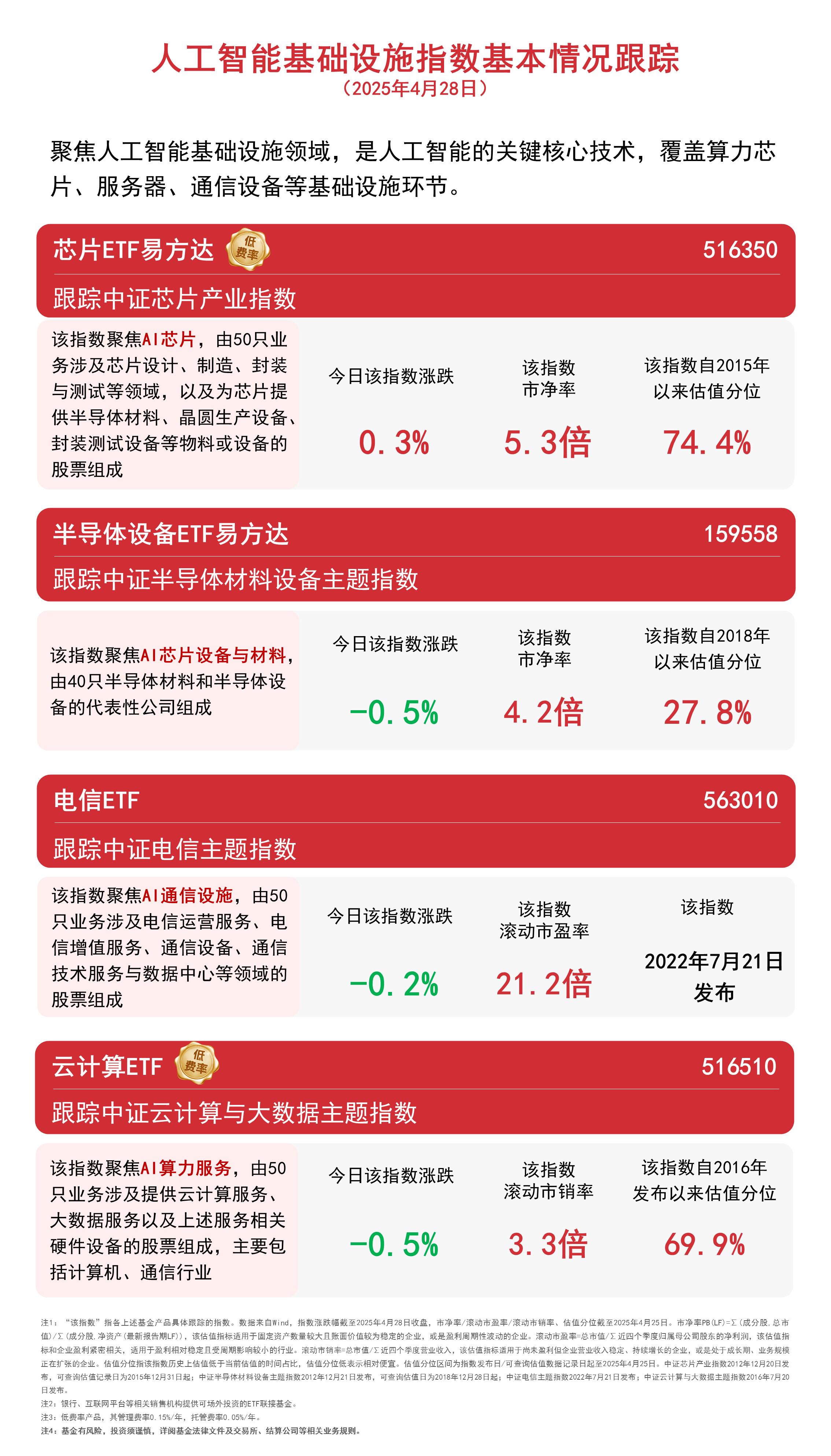 截至收盘,中证芯片产业指数上涨0.3%,中证电信主题指数下跌0.2%,中证半导体材料设备主题指数下跌0.5%,中证云计算与大数据主题指数下跌0.5%。