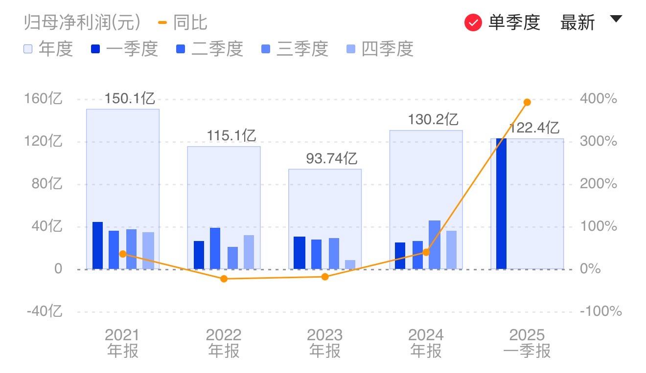 财联社4月29日电,国泰海通(601211.SH)公告称,公司发布2025年第一季度报告,营业收入为117.73亿元,同比增长47.48%;归属于母公司所有者的净利润为122.42亿元,同比增长391.78%。主要原因是吸收合并海通证券产生的负商誉带来营业外收入增加。小财注:2024年Q4净利35.01亿元,据此计算,Q1净利环比增长249.67%。