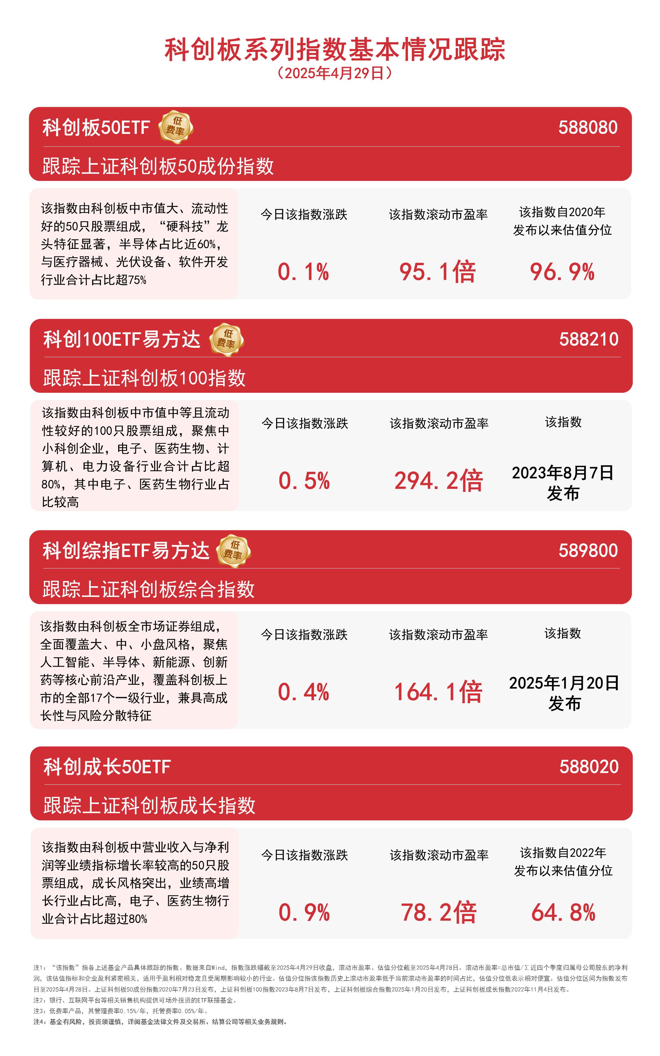 截至收盘,上证科创板成长指数上涨0.9%,科创100指数上涨0.5%,科创综指上涨0.4%,上证科创板50成份指数上涨0.1%。Wind数据显示,截至4月28日,科创综指ETF易方达(589800)连续11个交易日获资金净流入,合计超20亿元,产品规模创历史新高;科创板50ETF(588080)连续4个交易日获资金加仓,合计金额超2亿元。