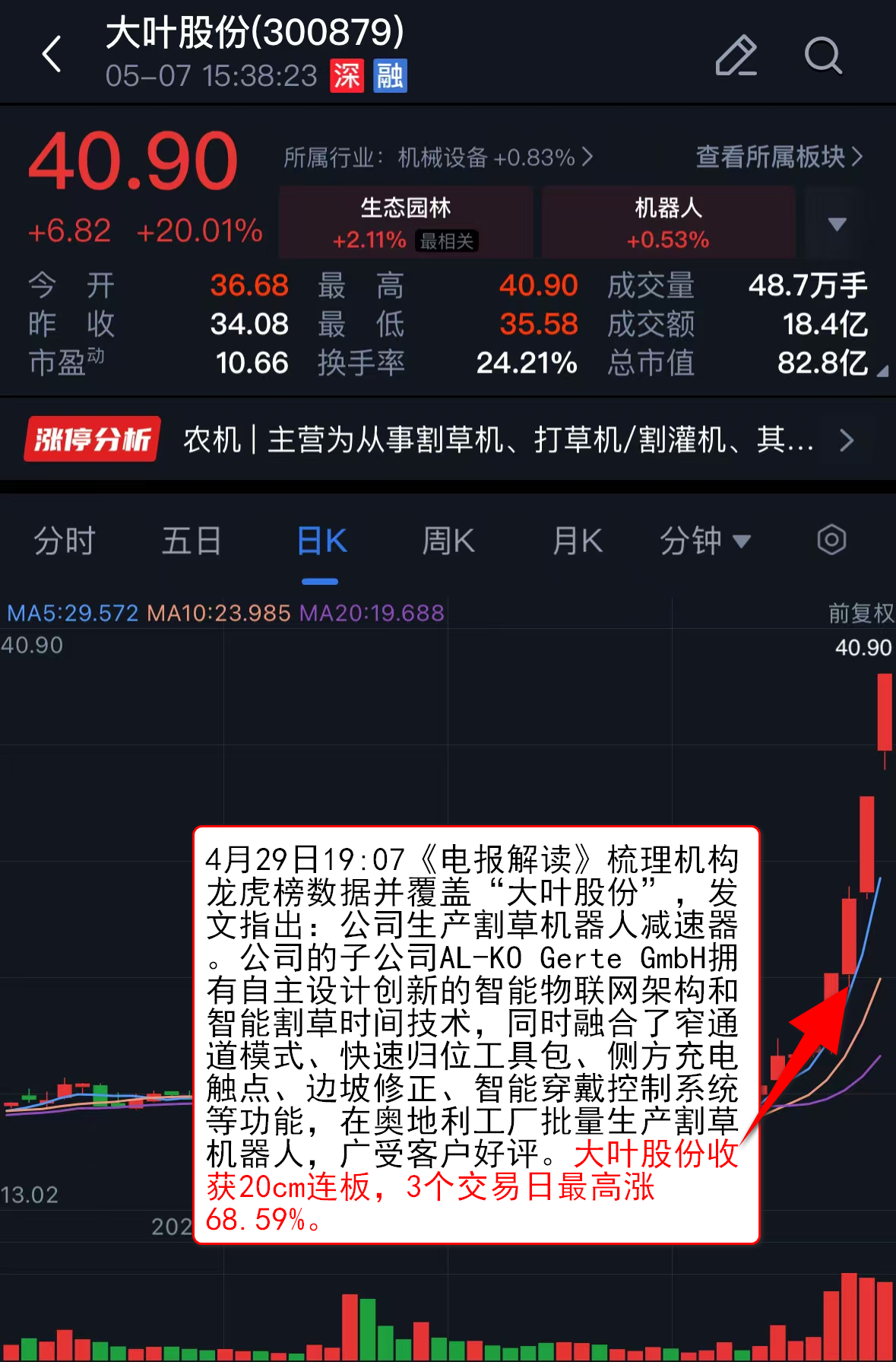 4月29日19:07《电报解读》梳理机构龙虎榜数据并覆盖“大叶股份”,发文指出:公司生产割草机器人减速器。公司的子公司AL-KO Gerte GmbH拥有自主设计创新的智能物联网架构和智能割草时间技术,同时融合了窄通道模式、快速归位工具包、侧方充电触点、边坡修正、智能穿戴控制系统等功能,在奥地利工厂批量生产割草机器人,广受客户好评。大叶股份收获20cm连板,3个交易日最高涨68.59%。