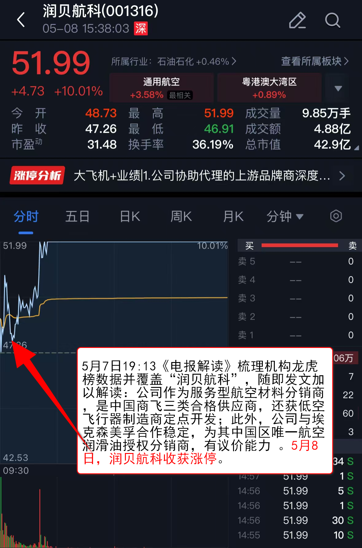 5月7日19:13《电报解读》梳理机构龙虎榜数据并覆盖“润贝航科”,随即发文加以解读:公司作为服务型航空材料分销商,是中国商飞三类合格供应商,还获低空飞行器制造商定点开发;此外,公司与埃克森美孚合作稳定,为其中国区唯一航空润滑油授权分销商,有议价能力 。5月8日,润贝航科收获涨停。